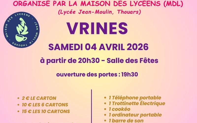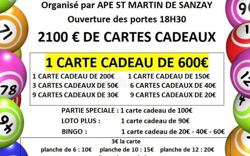 L'APE Moutiers - La Chapelle organise en partenariat avec Virginie RDV LOTO, un grand LOTO le dimanche 22 mars à la salle René Cassin de Mauzé-Thouarsais à partir de 14h30. 2600€ de lots à gagner ! 1er lot : Carte cadeau de 1100€ et de nombreux autres lots (partie spéciale, bingo, ...) Ouverture de la salle à partir de 13h. 2€ le carton, 10€ les 6 et 15€ les 10. Réservation par téléphone ou sms auprès de Virginie : 06 61 44 78 12 (du lundi au vendredi de 17h à 20h).