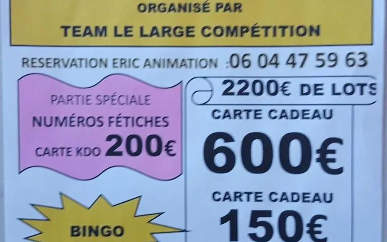 2500€ de lots (cartes cadeaux de 600€, 200€, 120€...). Animé par Eric Animation.