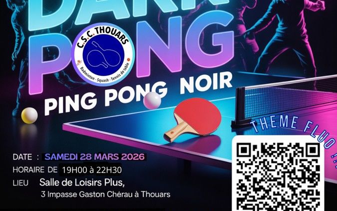 Le club de tennis de table du CSCT vous invite à une soirée festive : le Dark Ping. C'est du tennis de table dans le noir, éclairé par de la lumière UV ou tout est fluo : la table, le filet, la raquette et la balle. L'idée est de s'amuser entre amis ou en famille en pratiquant le ping-pong d'une manière fun en suivant le rythme de la musique avec les LED comme seule source de lumière !! Pas besoin d'être un pro ou d'avoir une licence, c'est ouvert à tous ! T-shirt blanc ou déguisement fluo et chaussure de sport conseillés !!!!! Prêt de matériel, restauration rapide et buvette sur place organisé par le club du CSCT Tennis de Table