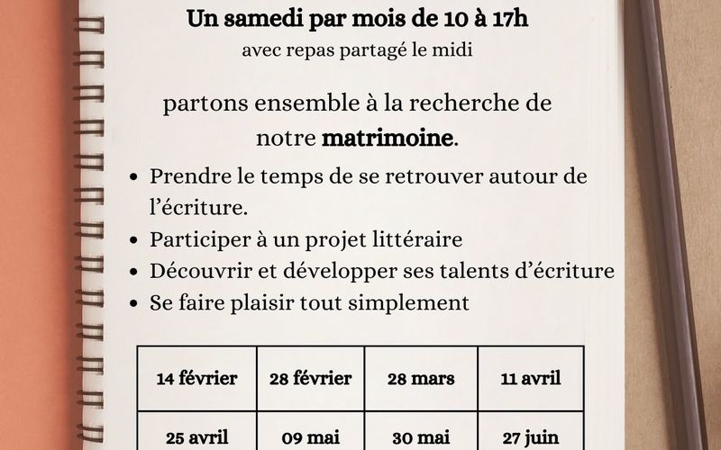 Animé par Marianne Billot, bénévole et autrice du livre "Fais ta valise et assieds-toi". Un atelier régulier pour partir ensemble à la recherche de notre matrimoine. L'occasion de prendre le temps de se retrouver autour de l'écriture, de participer à un projet littéraire, de découvrir et développer ses talents d'écrivain.e, et se faire plaisir simplement ! Plusieurs dates proposées tout au long de l'année, possibilité de venir à une seule date. Participation à prix libre. Repas partagé le midi, chacun apporte quelque de sucré ou salé.