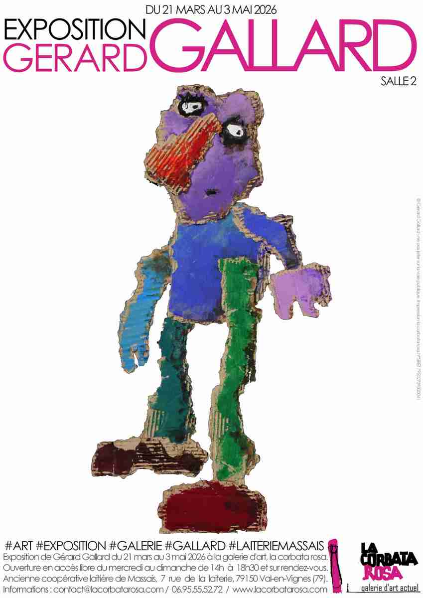 La corbata rosa, galerie d'art actuel professionnelle et indépendante fondée en 2013, présente une exposition personnelle d’une figure de l’art singulier l’artiste Gérard Gallard (1939-2025). Cette présentation importante se tient dans notre salle principale du samedi 21 mars au dimanche 3 mai 2026 (prolongation jusqu'au 10 mars 2026). Elle rassemblera une centaine de travaux de l’artiste que nous avions eu l’occasion d’accueillir à plusieurs reprises de son vivant sur notre ancien site de Rochefort-sur-Loire. Elle regroupe essentiellement des peintures, sculptures et dessins sur cartons, papiers, bois, toiles et tôles réalisées dans son atelier à Thouars. Installé dans les Deux-Sèvres depuis une dizaine d’années après avoir notamment vécu à Saumur et Denée, Gérard Gallard, parfois appelé Gé Gallard ou Gérard Gallard Legoya, y poursuivait sans relâche ses recherches plastiques. Vous pourrez également à cette occasion découvrir en salle une, l’exposition personnelle de l’artiste François Chauvin jusqu’au 22 mars, puis celle de Paul Renault à partir du 28 mars, ainsi que de nombreuses œuvres originales d’une dizaine d’artistes professionnels sur les 4 salles de notre cabinet de curiosités. La corbata rosa est accessible en visite libre du mercredi au dimanche de 14h à 18h30, ainsi que sur rendez-vous les autres jours et créneaux. Au plaisir de vous recevoir à Val en Vignes pour ces événements. François-Victor Brunet & Rachel Thibault pour la corbata rosa. Gérard Gallard, exposition personnelle du samedi 21 mars 2026 au dimanche 3 mai 2026 (prolongation jusqu'au 10 mars 2026) en salle 2 de la galerie d’art actuel la corbata rosa. Ouverture en accès libre du mercredi au dimanche de 14h à 18h30 ainsi que sur rendez-vous les autres jours et créneaux. La corbata rosa, ancienne coopérative laitière de Massais, 7 rue de la laiterie, 79150 Val-en-Vignes. contact@lacorbatarosa.com / 06.95.55.52.72 / www.lacorbatarosa.com