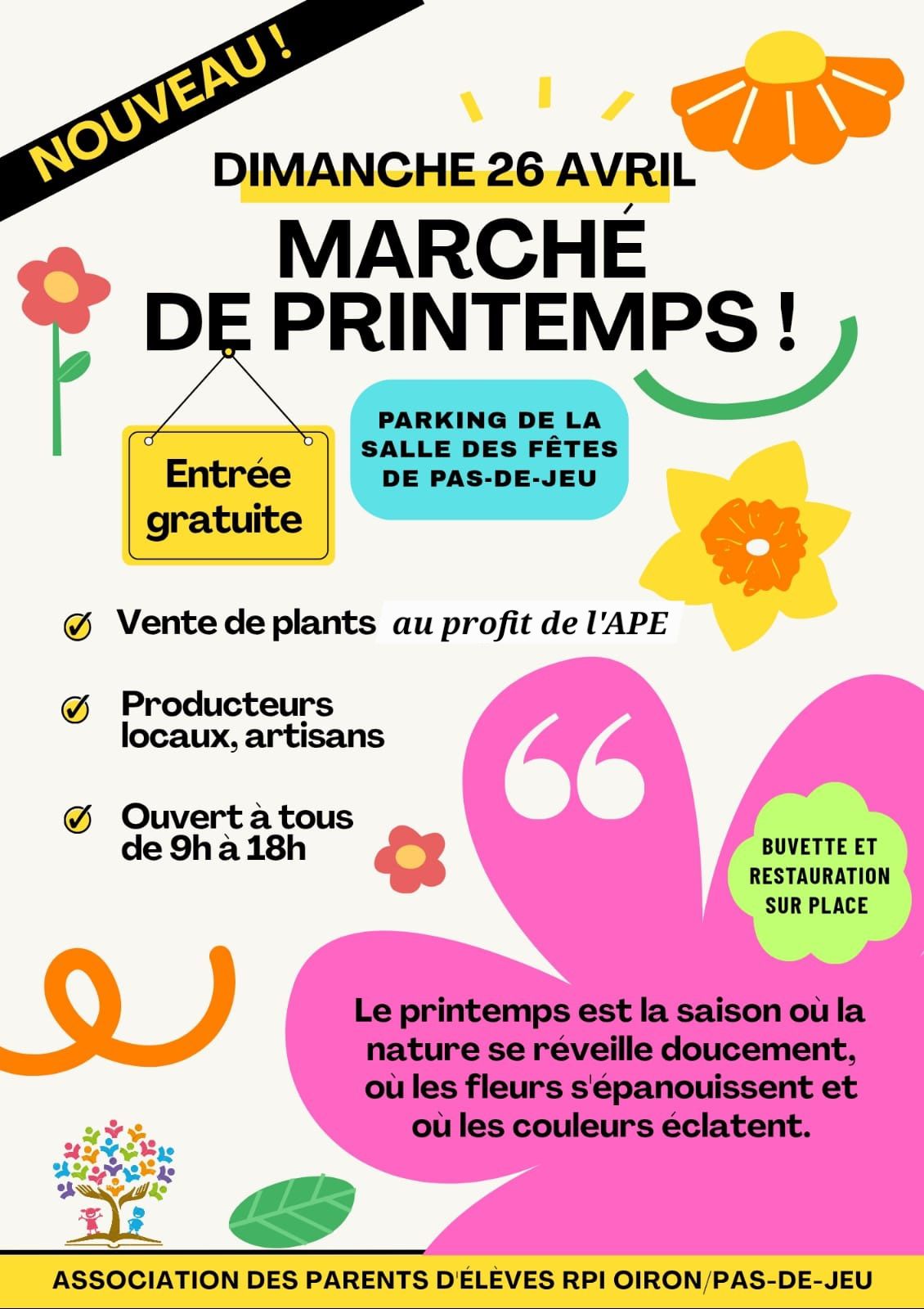 Le printemps est la saison où la nature se réveille doucement, où les fleurs s'épanouissent et où les couleurs éclatent. Vente de plants (au profit de l'APE). Producteurs locaux et artisans. Buvette et restauration sur place. Entrée gratuite.