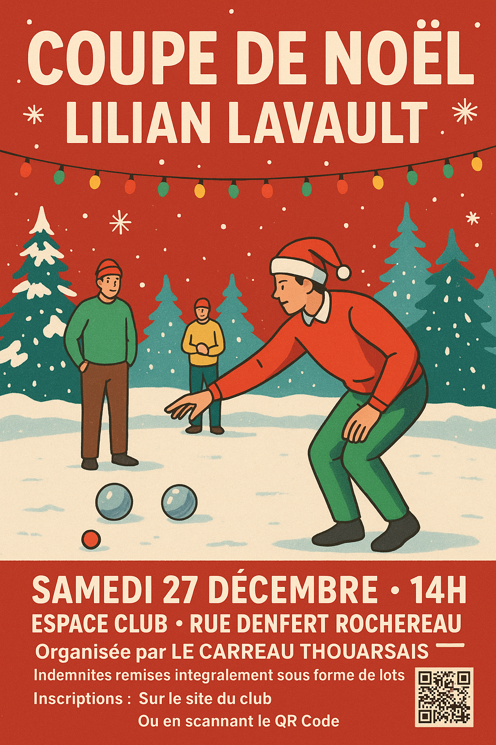 Coupe de Noël Lilian LAVAULT, concours de pétanque en triplette mixte, 15 € la triplette, en ABC, Indemnités en lots. Inscription sur le site du Carreau Thouarsais. Places limitées.