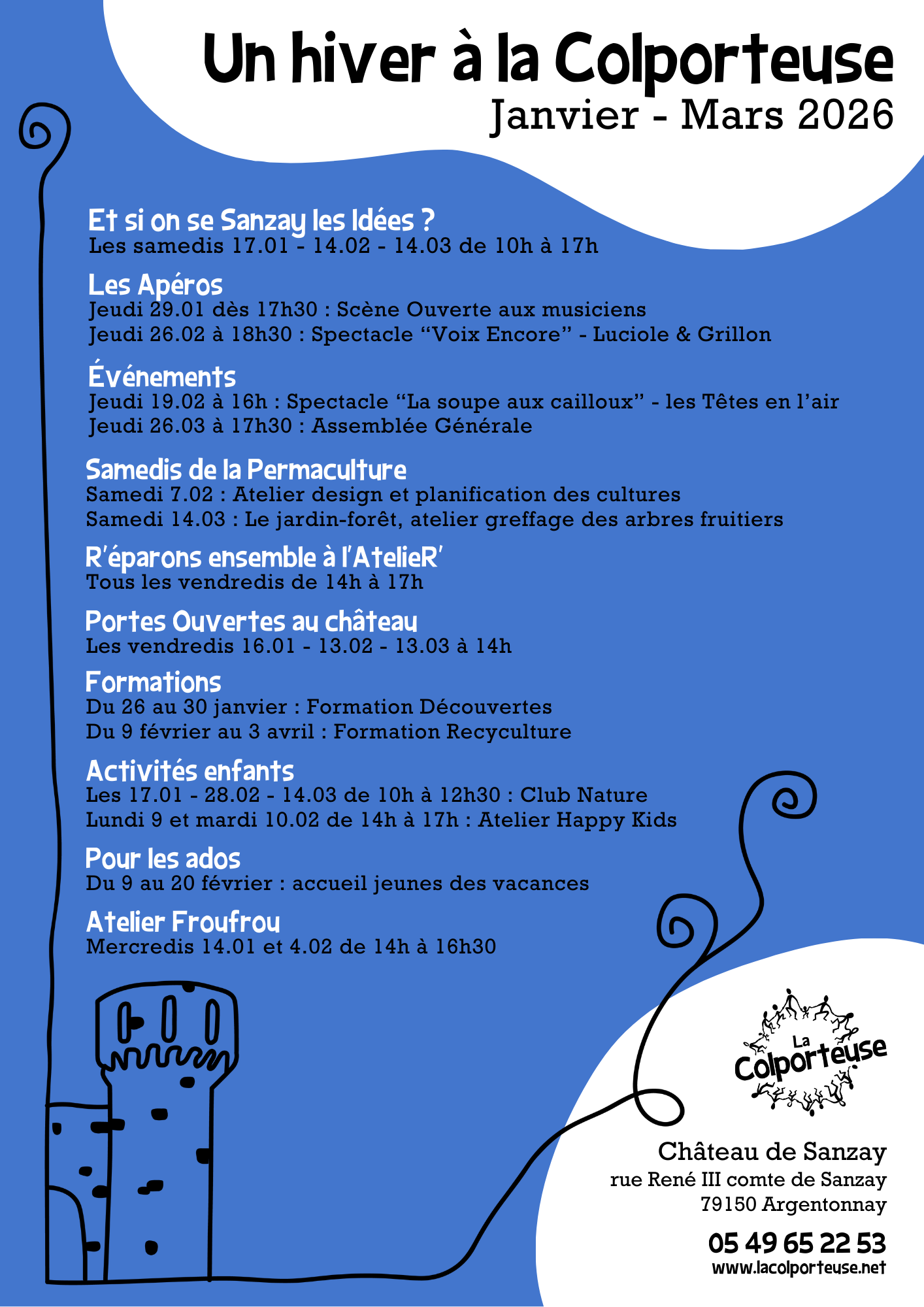 Les colporteurs vous accueillent pour une journée portes ouvertes au château de Sanzay ! On vous proposera diverses activités, en ouvrant les portes des pièges à ennuis. Au programme : une vente friperie, un atelier transfo' en cuisine, un atelier radio, et une visite historico-contée en début d'après-midi ! Bar asso' ouvert toute la journée et le midi, venez avec un plat à partager ! Entrée libre et gratuite.