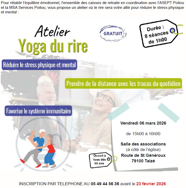 La MSA Service Poitou organise un atelier "Yoga du Rire". Réduire le stress physique et mental, prendre de la distance avec les tracas du quotidien, favoriser le système immunitaire. Gratuit. Pour tous dès 60 ans.